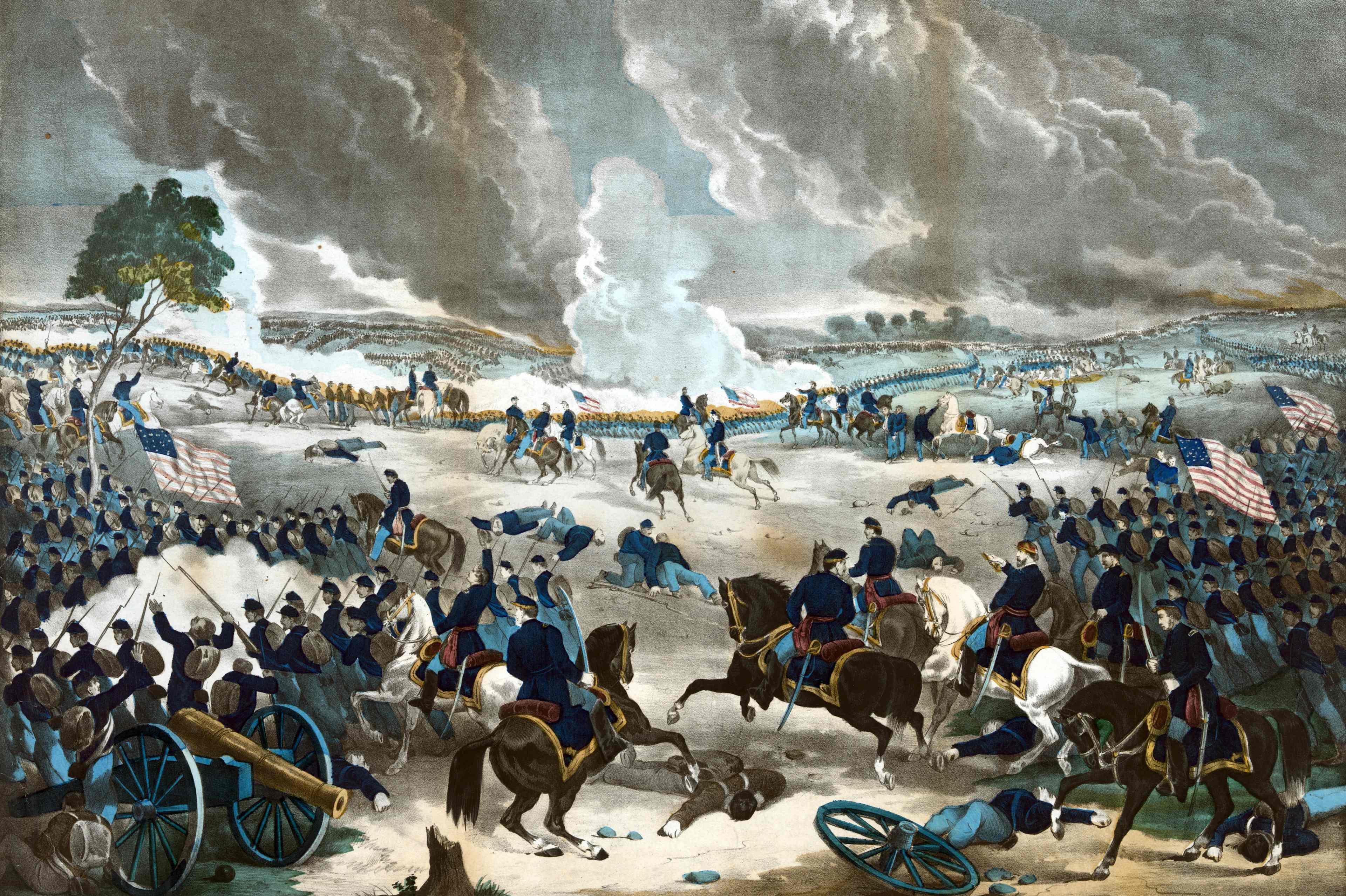 UNSPECIFIED - : American Civil War 1861-1865: Battle of Gettysburg 1-3 July 1863, ending Lee's invasion of the North. Union infantry advancing from the right. Print of 1867. Fighting Action Soldier Flag Weapon Rifle Bayonet Field Gun Fire Smoke (Photo by Universal History Archive/Getty Images)