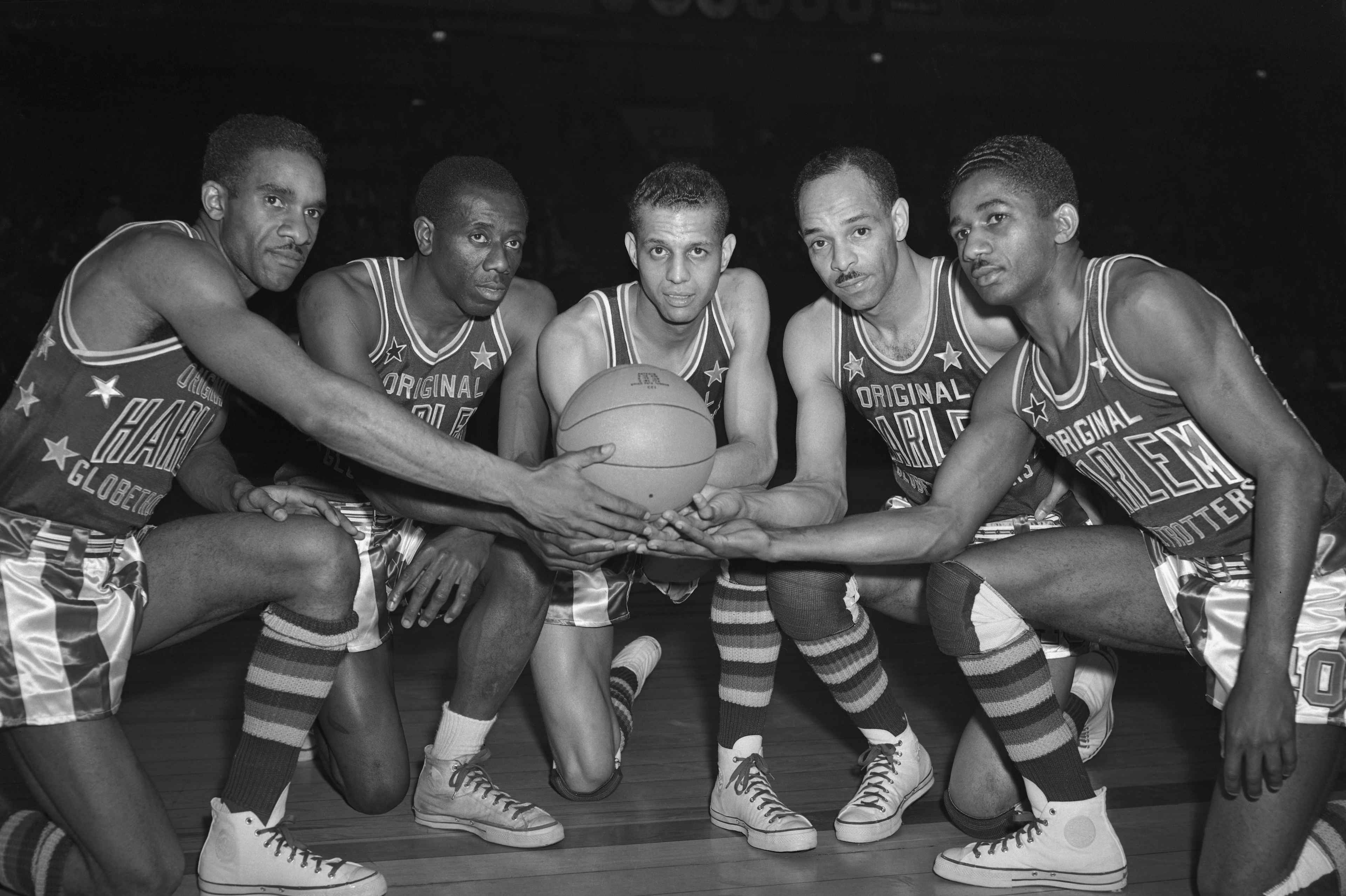 Team members pose before embarking on a four-month tour of Great Britain, Europe and North Africa in 1951. The team played 76 games in England, Ireland, France, Belgium, Holland, Luxembourg, Italy, Spain, Portugal, Germany, Austria and North Africa.From left to right: Ermer Robinson; Reece “Goose” Tatum; Bill Brown; Bill “Pop” Gates; and Marques Haynes.