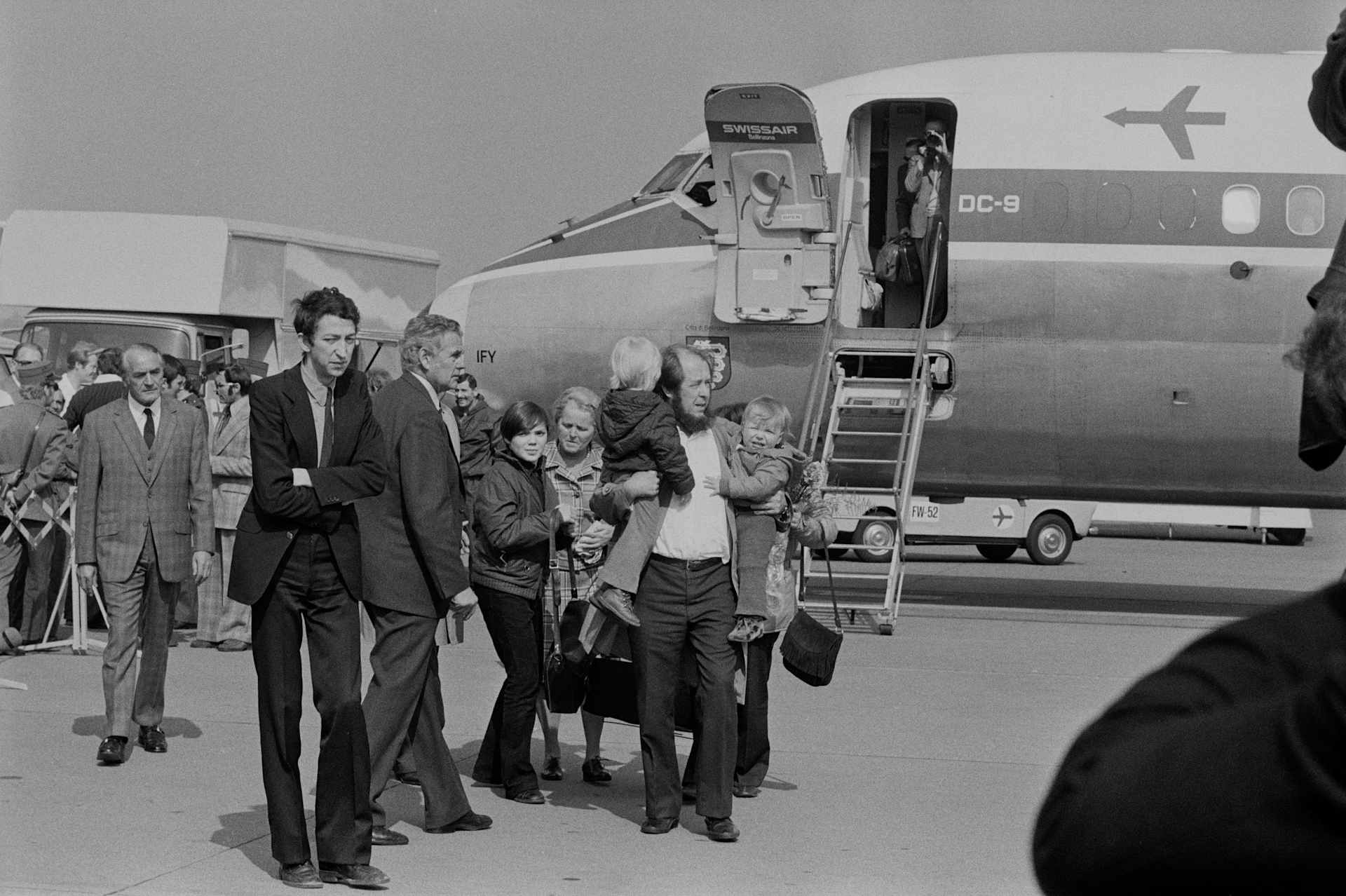 Soviet dissident Alexandre Soljenitsyn greets his sons Ignat Soljenitsyn,18 months and Yermolai Soljenitsyn, (3 years) as they arrive in Zurich. 29 March 1974. (Photo by James Andanson/Sygma via Getty Images)