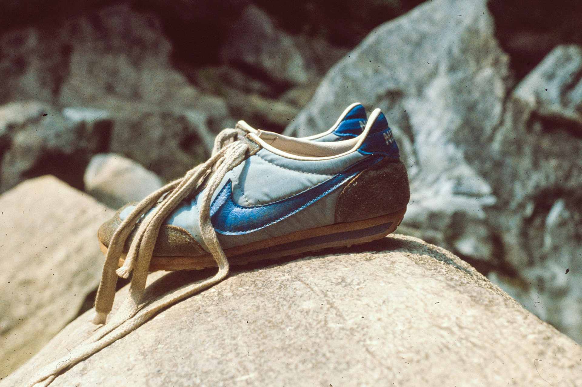 ITHACA, NY – CIRCA 1974: A general view of a Nike Waffle trainer running shoe on a rock circa 1974 at a gorge in Ithaca, NY. (Photo by Amy Abramson/Icon Sportswire via Getty Images)