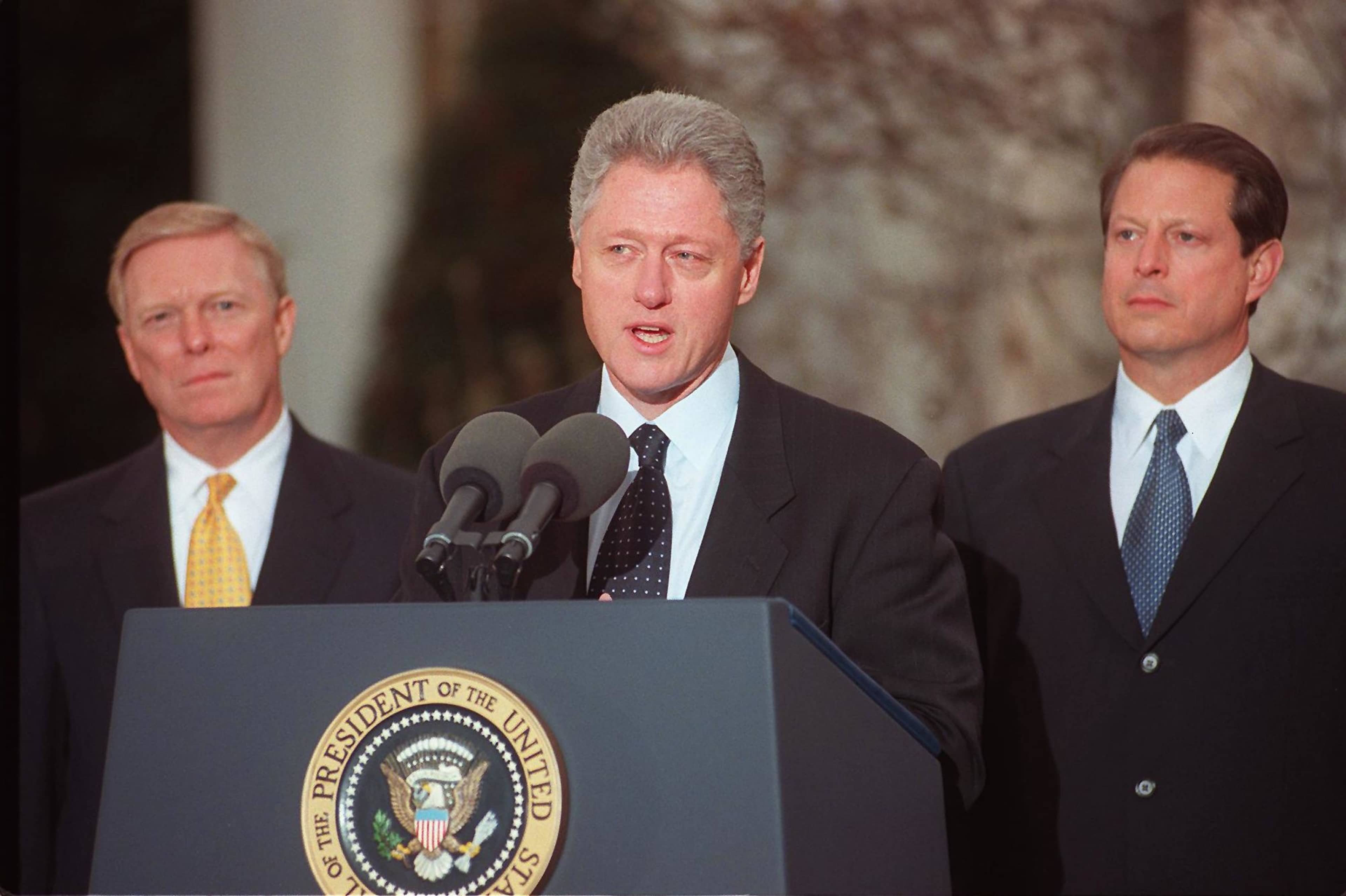 WASHINGTON, DC - DECEMBER 19: US President Bill Clinton (C) addresses the nation 19 December from the White House after the US House of Representatives impeached him on charges of perjury and obstruction of justice. (From L-R:) US House Minority Leader Richard Gephardt, Clinton, and US Vice President Albert Gore. (Photo credit should read GEORGE BRIDGES/AFP via Getty Images)