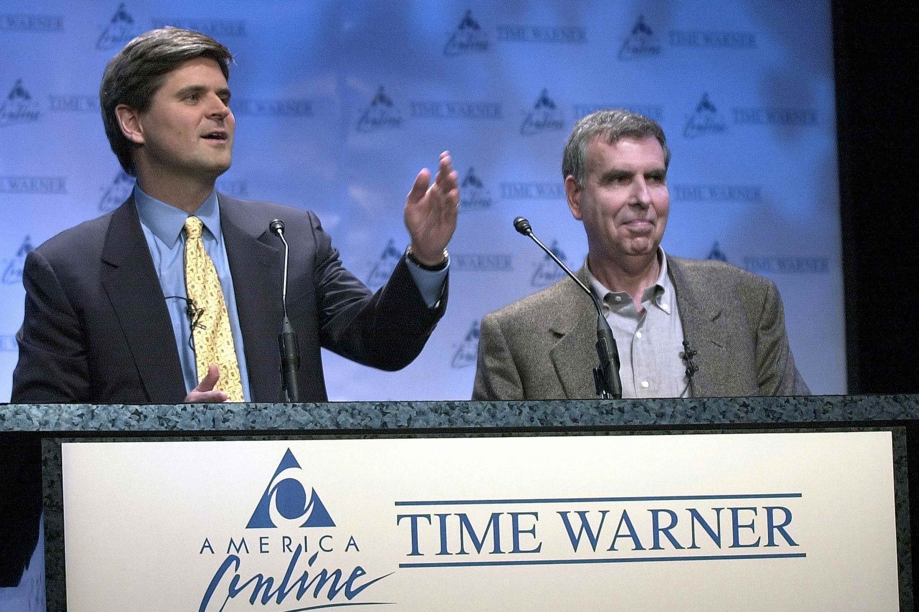 NEW YORK, UNITED STATES: America Online Chairman Steve Case (L) and Time Warner Chairman Gerald Levin (R) announce their companies' merger 10 January 2000 at a New York news conference. The new company will be called AOL Time Warner. (ELECTRONIC IMAGE