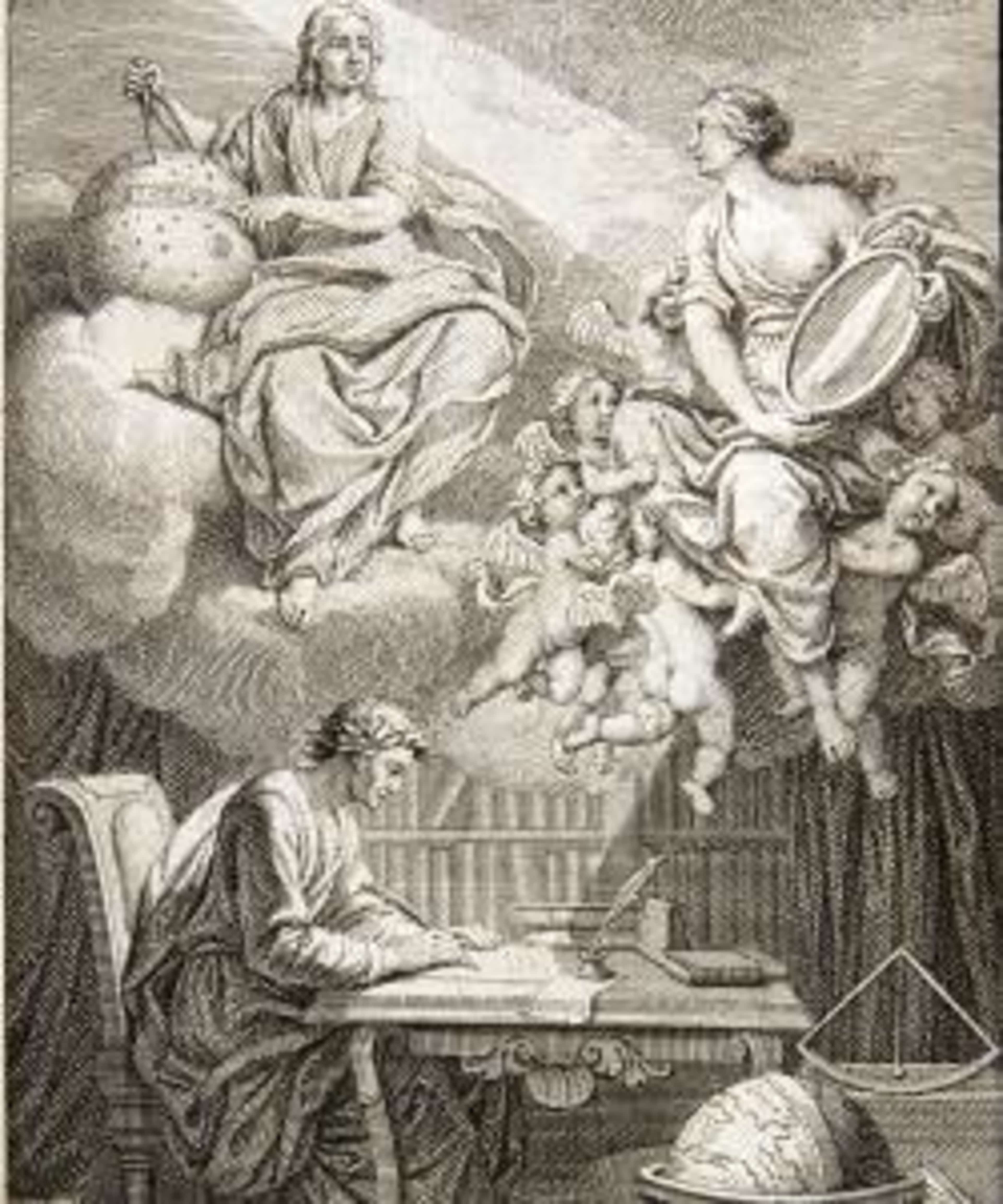 Illustration of Voltaire translating the work of Isaac Newton