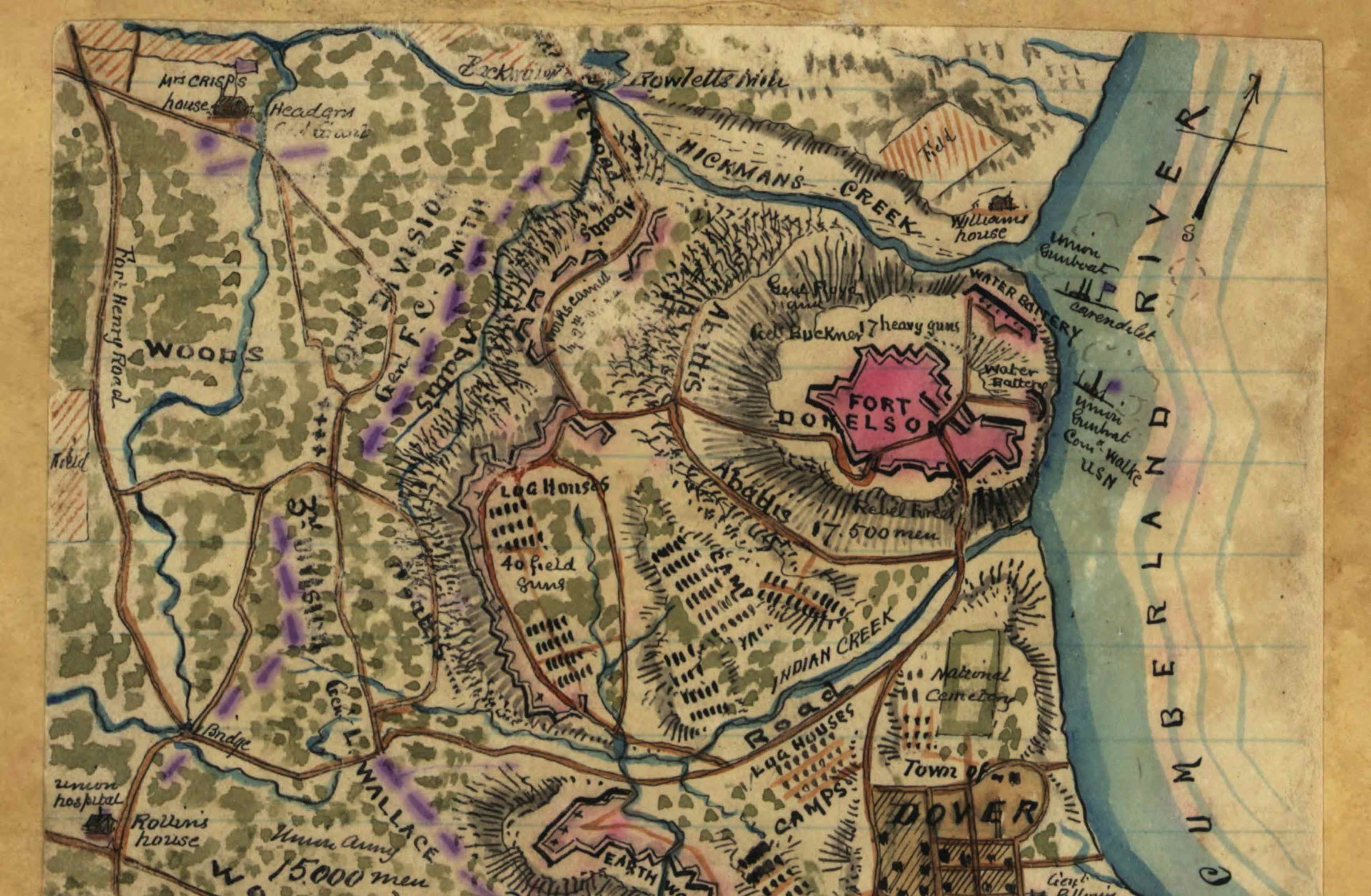 A map of Fort Donelson. The fall of this heavily fortified fort on the Tennessee River was deep in the heart of the confederacy. It ensured that Kentucky would stay with the Union.