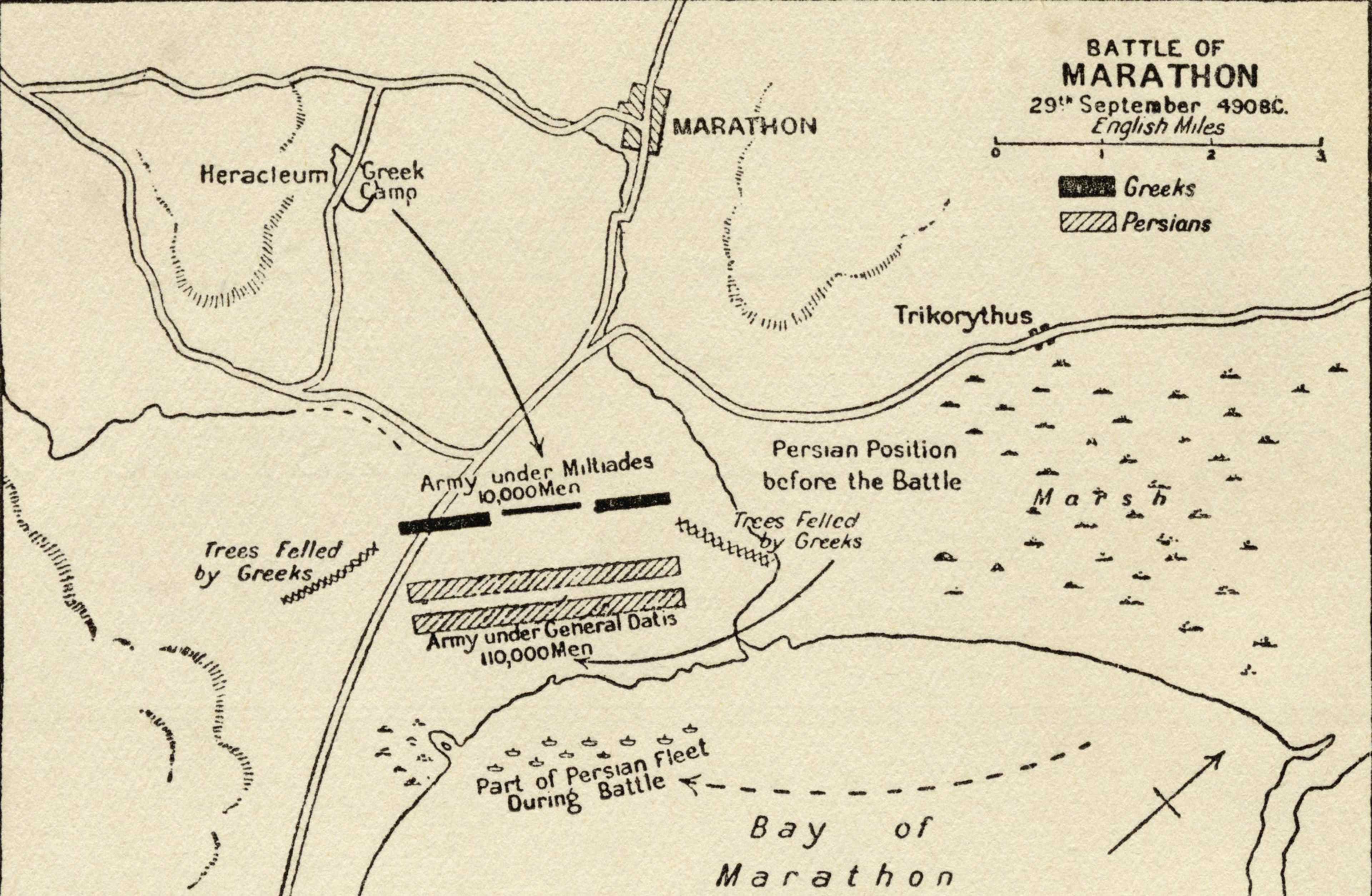 The first encounter on the Greek mainland between East (Persia) and West (Greece) took place in August or September of 490 B.C., on the small seaside plain of Marathon, 26 miles northeast of Athens. The Persian expeditionary force of Darius I was not large, perhaps numbering under 30,000.