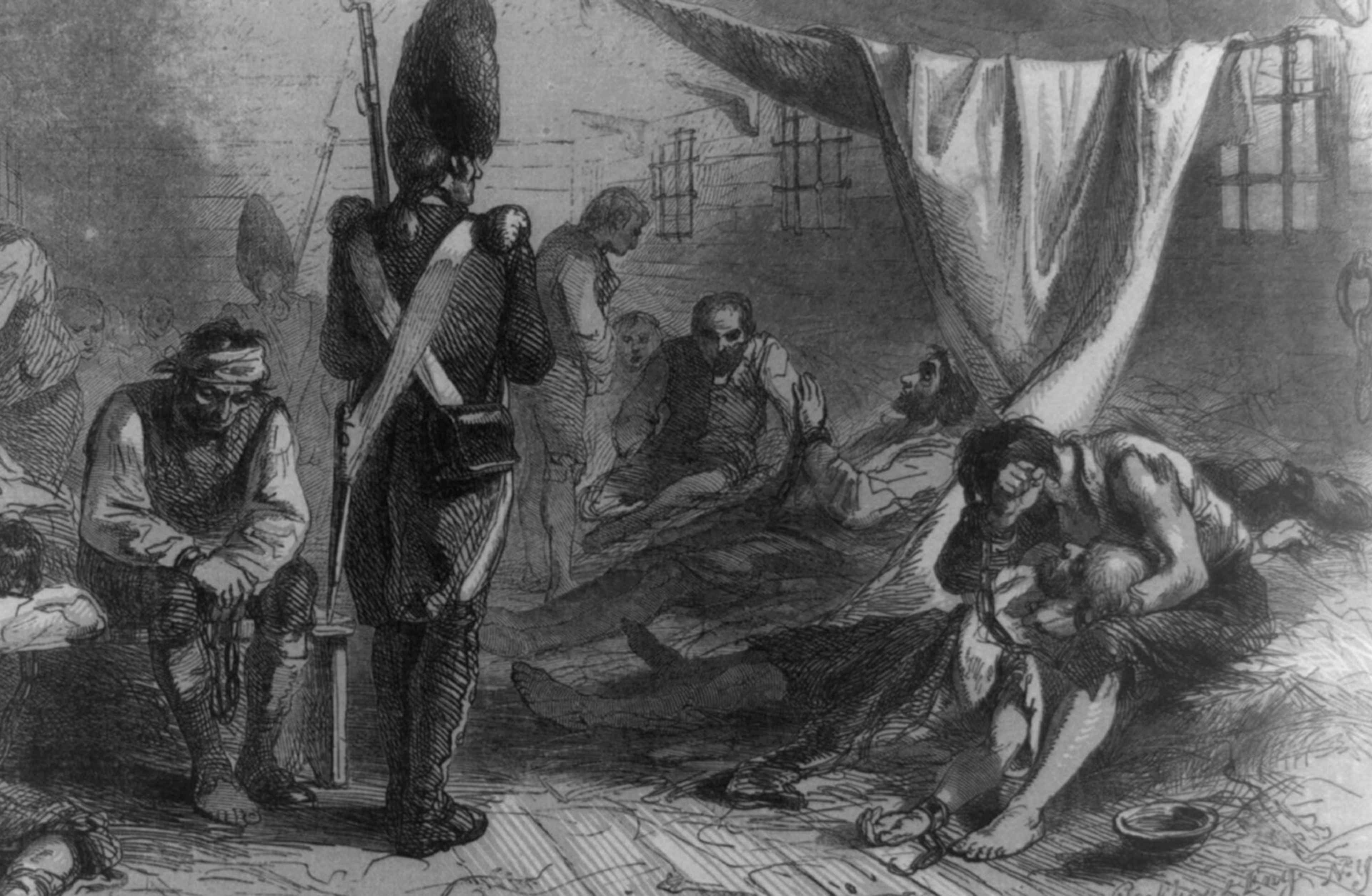 But the guards were not in a party mood. Using their bayonets, they forced the prisoners below decks and locked the hatches. When the singing continued, the guards flung open the hatches and “with lanterns in one hand and cutlasses in the other… cut and wounded all within their reach,” wrote George Taylor, author of an early history of prison ships, Martyrs to the Revolution (1855). “Then, to gratify their hellish feelings, they closed the hatches and left the wounded and dying, in darkness, without the least means of dressing their wounds or stopping the flow of blood.”