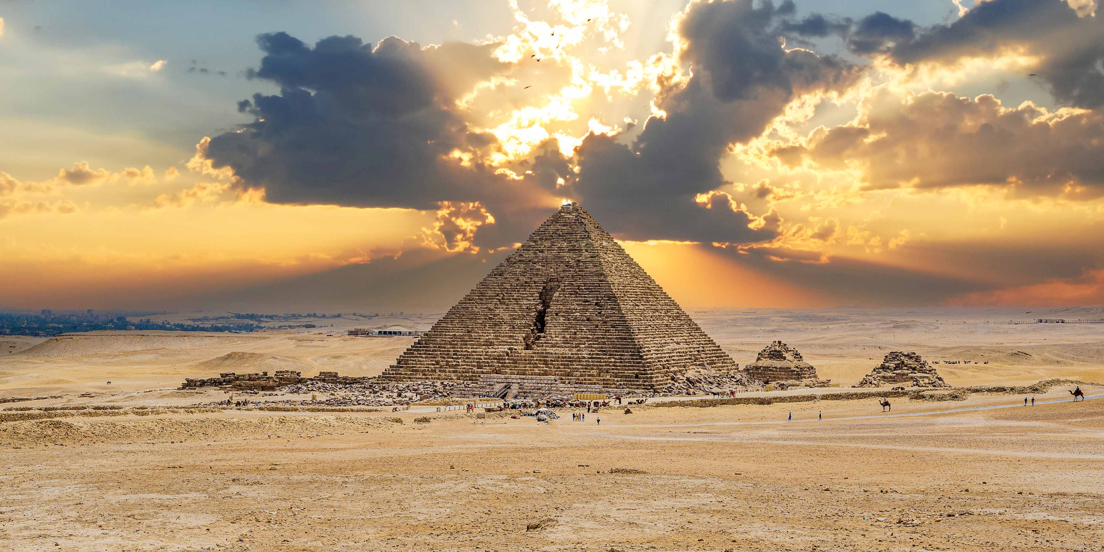 The Giza Plateau, just west of Cairo, is home to about ten pyramids in total, although the smaller pyramids are overshadowed by the three largest. The entire country of Egypt has more than 120 ancient pyramids, but the ones at Giza have been famous since antiquity because of their immense scale.