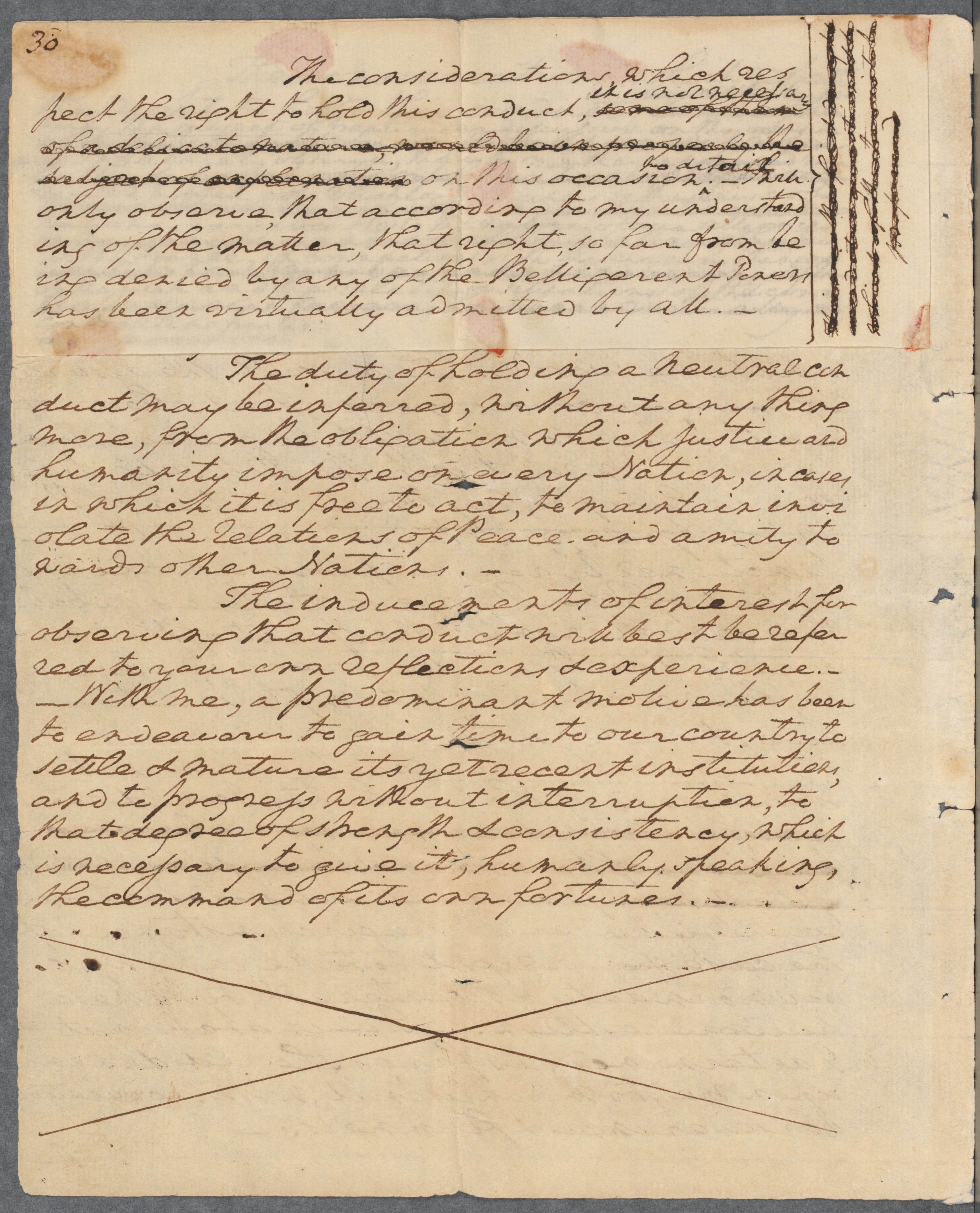 The inducements of interest for observing that conduct will best be referred to your own reflections and experience. With me a predominant motive has been to endeavor to gain time to our country to settle and mature its yet recent institutions, and to progress without interruption to that degree of strength and consistency which is necessary to give it, humanly speaking, the command of its own fortunes.