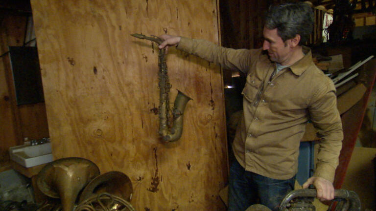 The guys stumble on an atomic-era spaceship clock; Junk Man Bob's huge collection.