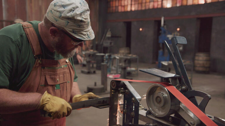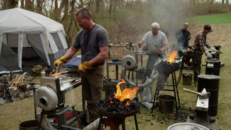 Four master smiths compete alongside their apprentices to forge a trench knife.