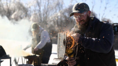 Four bladesmiths scavenge a construction site to salvage their own knife-making materials.